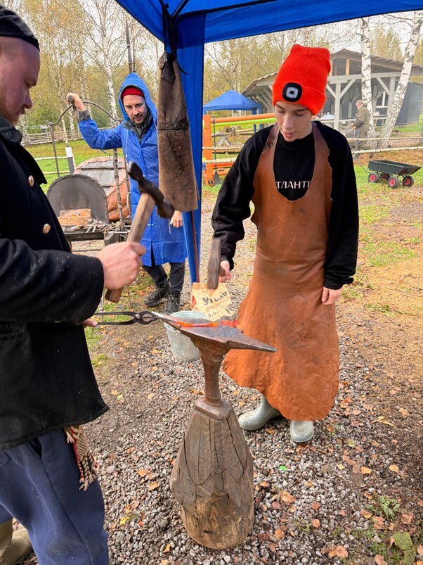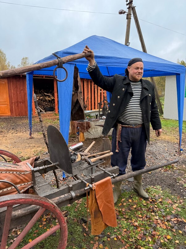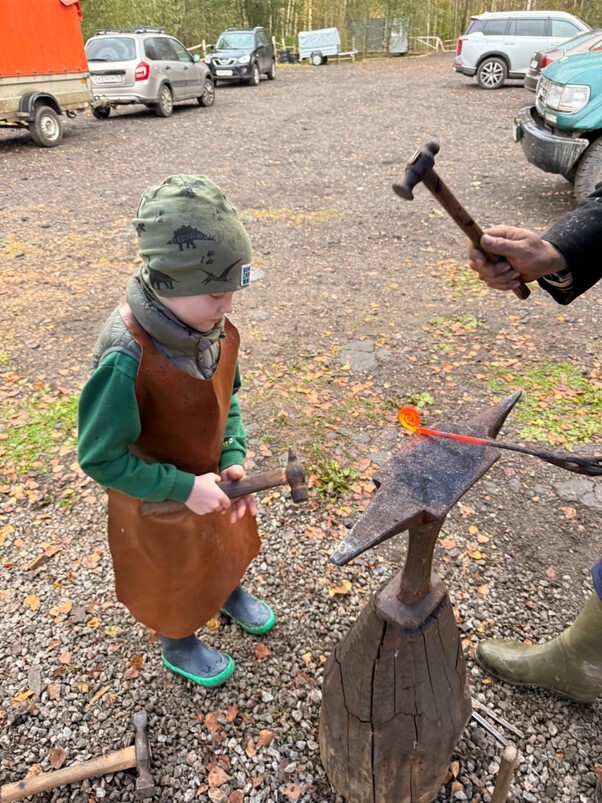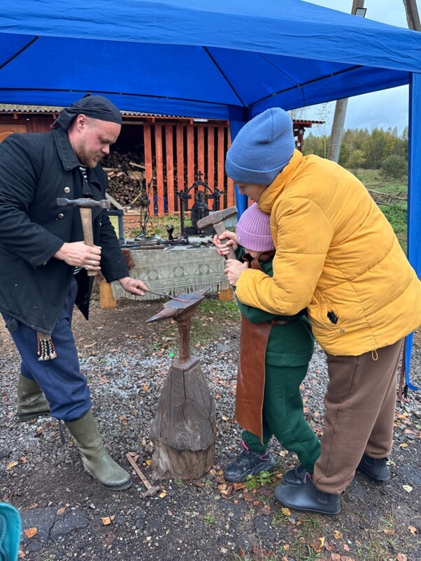 Рядом с верандой, под другим шатром, разместил свои образцы работ кузнец Дмитрий Игумнов. Он также привез заготовки, чтобы с каждым участником мастер-класса сковать металлическое изделие. Всех впечатлила телега с мехами для раздувания углей. Под чутким контролем мастера дети стучали молотками по металлическому пруту на наковальне, как настоящие кузнецы! Увлекательное действо длилось около двух часов. Дети увезли домой собственноручно выкованные витые крючки, которые смогут с помощью родителей прикрепить дома к любой стене или мебели. А Дмитрий пригласил всех желающих посетить свою кузнечную усадьбу, находящуюся неподалёку — Трест Хитрого Лиса.