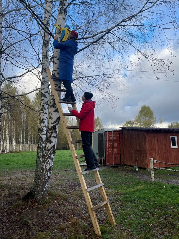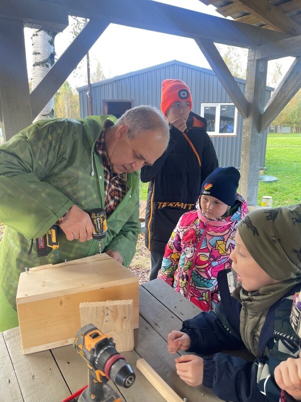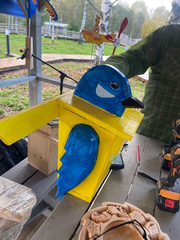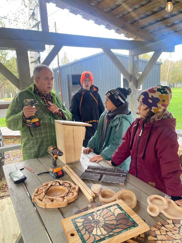Итак, два ремесла, можно сказать, освоены — следом все были приглашены на мастер-класс по изготовлению правильных скворечников, в которых точно гнездятся скворцы! Известный политтехнолог, а ныне любящий свое дело столяр Валерий Чирков поведал слушателям все нюансы: какая должна быть форма скворечника, угол наклона фасадной стены, размер отверстия, и каким способом крепить скворечник, чтобы ни хищники, ни другие птицы не представляли угрозу милому потомству. Детвора подержала в руках шуруповерт, а взрослые намотали знания на ус. В завершение скворечник, специально изготовленный мастером в подарок Усадьбе Кожиных и покрашенный в яркие цвета, был закреплен на ближайшей берёзе возле веранды.
