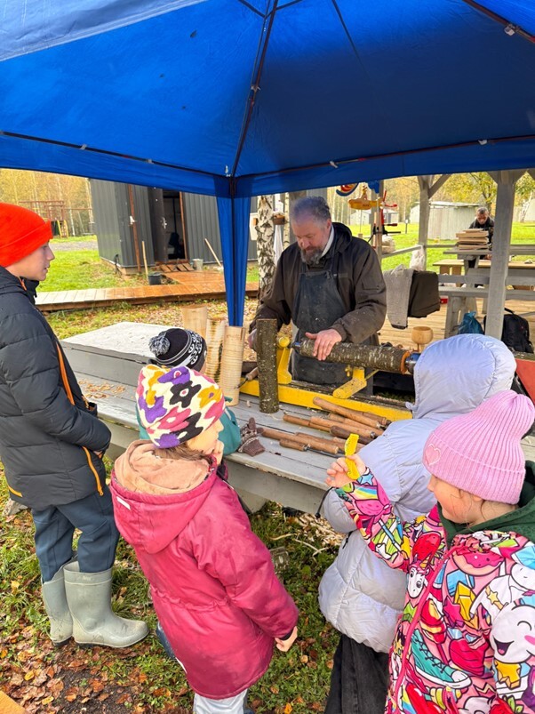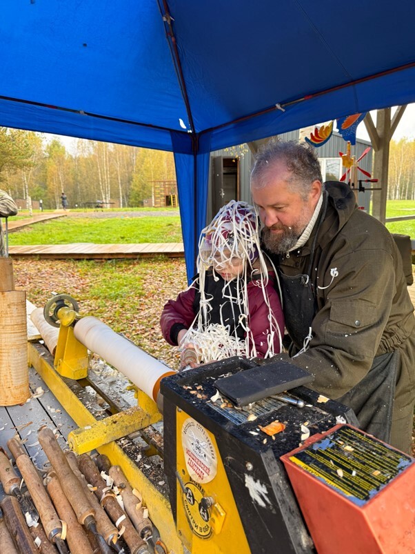 После освежающей прогулки по осеннему лесу все вернулись на базу. Возле веранды уже разместился уважаемый мастер из Мышкина, токарь по дереву Алексей Поснов. Он порадовал детей, обтачивая заготовки и создавая длиннющие деревянные стружки, завивающиеся в пружинки. Вот веселье!