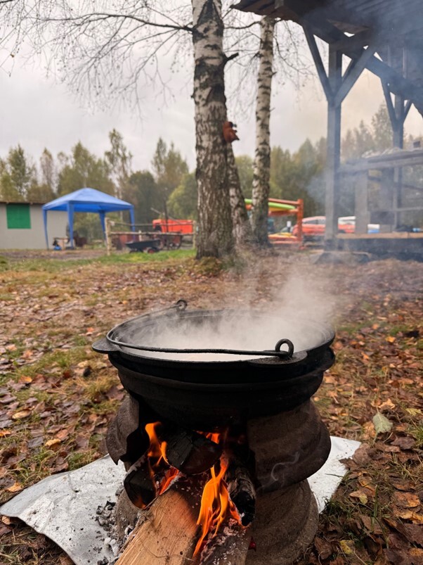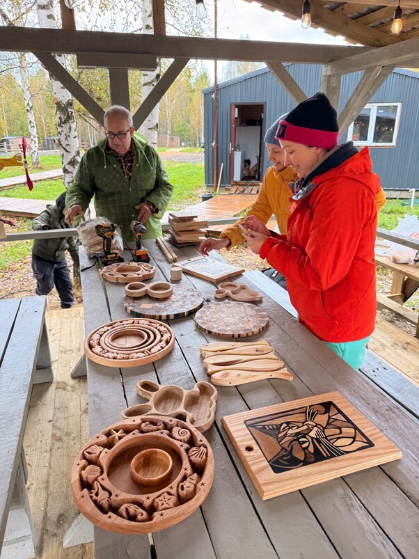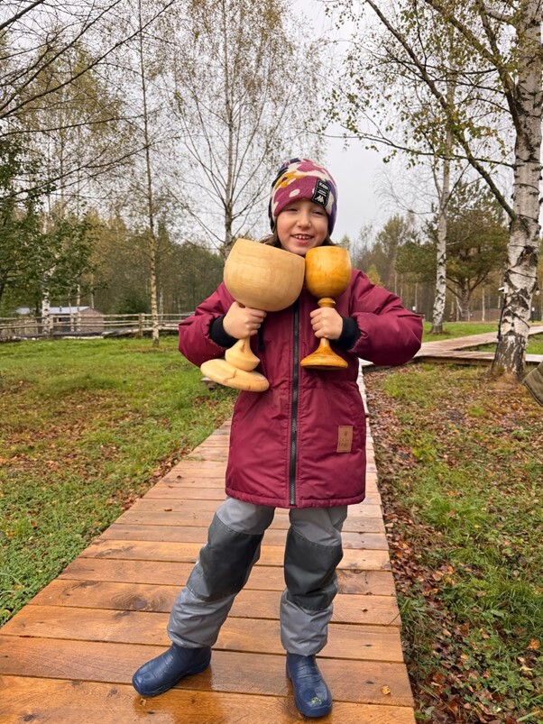 Тут и обед подоспел. Всех участников накормили копченым судаком, куриным супом и картошкой с ароматным маслом, приготовленными на мангале. С сытым желудком — приступили к делу! Дети увлеченно смотрели, как деревянная стружка отлетает от полена, а токарь придает форму изделию. Каждый желающий смог поработать у станка в защитных очках и собрать «облако» стружки. Да и самому Алексею так понравилась энергетика места и дружеская атмосфера мероприятия, что он щедро одаривал всех своими изделиями.
